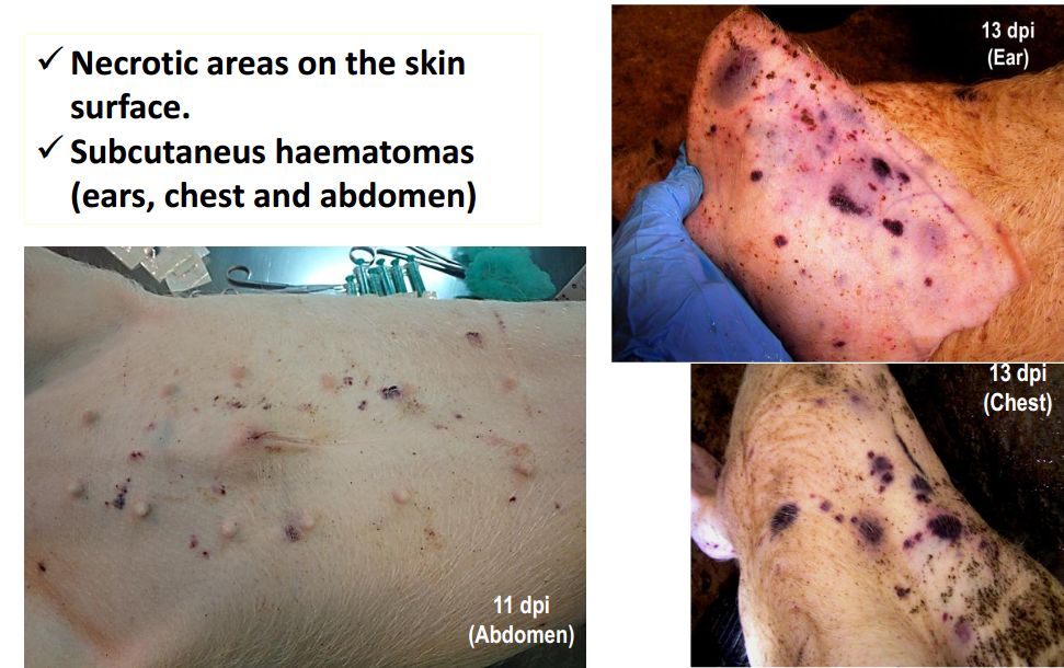 皮膚表面壞死,耳、胸、腹、前、后腿皮下血腫