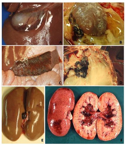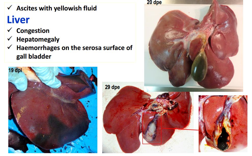 肝,黃色積液、堵塞、肝腫大、膽囊漿膜表面出血
