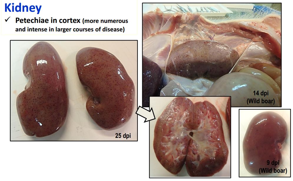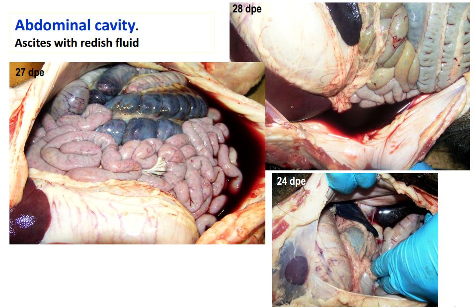 豬只呈現(xiàn)腹水、心包積液和膽囊和膽管壁的特征性水腫(圖42A),以及腎周水腫(圖42B)。脾臟初始表現(xiàn)為部分充血性脾腫大(圖42C),逐漸轉(zhuǎn)歸,留下一些病灶損害,最終消失。淋巴結(jié),主要是胃肝(圖42D)和腎淋巴結(jié)(圖42E),以及頜下腺、咽后、縱隔、腸系膜和腹股溝淋巴結(jié)出血、水腫和易碎,表現(xiàn)為深紅色血腫(Sanchez-Vizcaınoand Arias, 2012; Gomez-Villamandos et al., 2013)。腎出血(圖42F)比急性ASF形式更強(qiáng)烈(瘀點(diǎn)和瘀斑)和更廣泛的(皮質(zhì)、髓質(zhì)和骨盆)(Gomez-Villamandoset al., 1995a; Hervas et al., 1996)。
