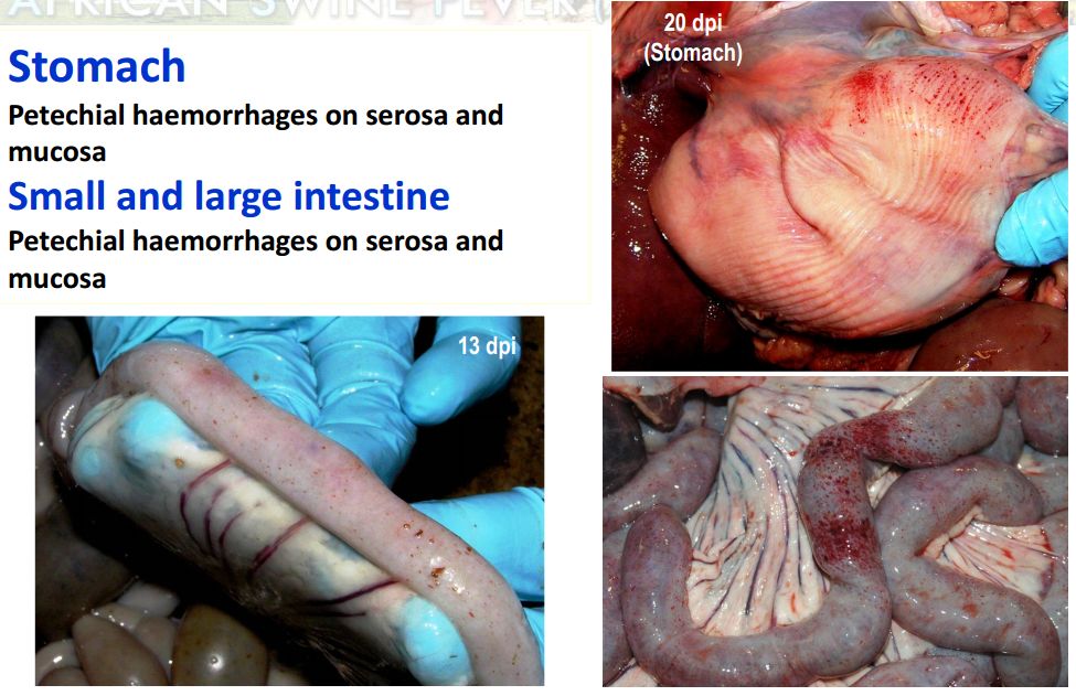 胃,漿膜和粘膜瘀點(diǎn)出血;小腸和大腸,漿膜和粘膜瘀點(diǎn)出血