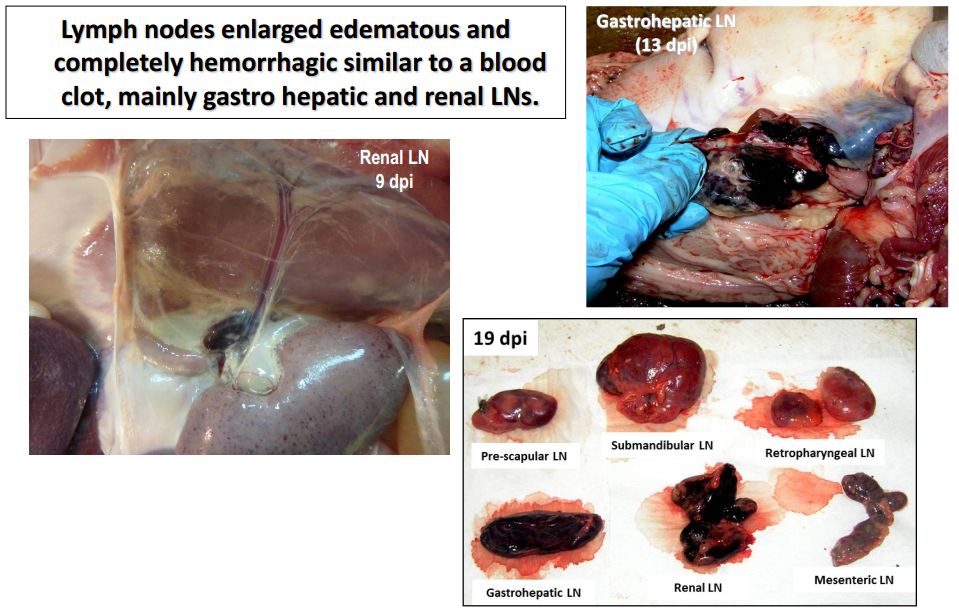 淋巴結(jié),主要是胃肝和腎淋巴結(jié),以及頜下腺、咽后、縱隔、腸系膜和腹股溝淋巴結(jié)出血、水腫和易碎,表現(xiàn)為深紅色血腫