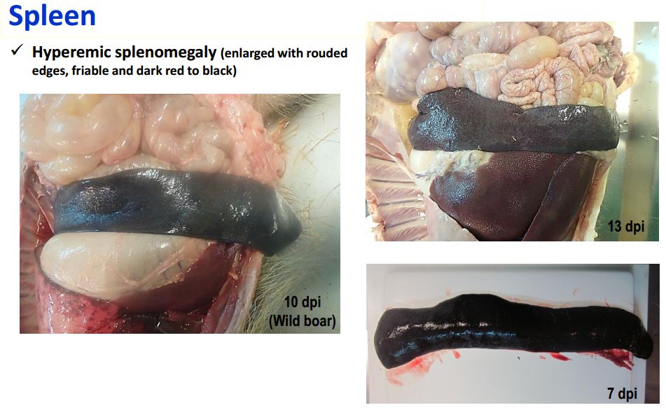 脾,脾腫大,易碎,暗紅色至黑色的,邊緣為圓形