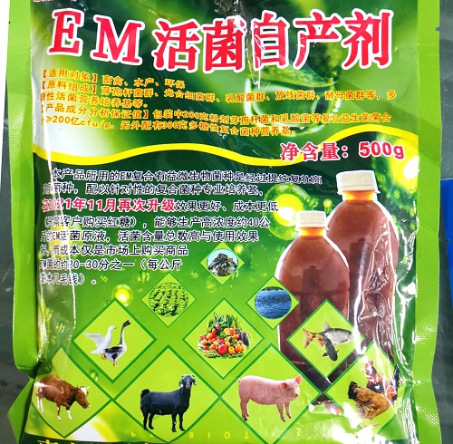 準(zhǔn)備一包“EM活菌自產(chǎn)劑”(市場售價20元),將本產(chǎn)品包裝中粉劑、500-1000克紅糖與溶入40公斤約35℃的溫水中,簡單攪拌然后密封放在室溫25℃以上的環(huán)境下進行培養(yǎng),僅需24-48小時即可完成培養(yǎng),PH值在3.5左右,常溫下3個月內(nèi)每毫升含復(fù)合益生菌在100-300億,時間越長菌種數(shù)量會隨之下降。密封可以保存一年以上,但3個月內(nèi)使用效果更好。