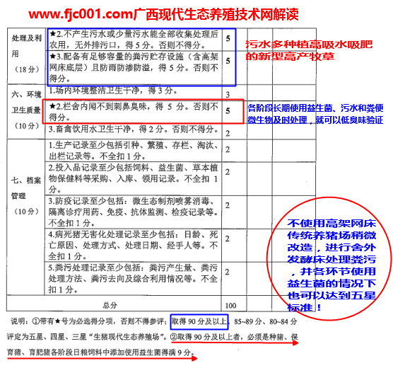 按照廣西畜禽現(xiàn)代生態(tài)養(yǎng)殖的要求,在設(shè)施標(biāo)準(zhǔn)化的情況下,生態(tài)養(yǎng)豬場不一定是高架網(wǎng)床等新型模式,只要達(dá)到以下幾個要求即可(微生物+模式)。下面的技術(shù)具有只需要簡單改善、投入成本低、實用性強等特點,可以滿足大部分傳統(tǒng)養(yǎng)豬場進(jìn)行實施。先要仔細(xì)熟悉廣西生豬現(xiàn)代生態(tài)養(yǎng)殖技術(shù)驗收的評分細(xì)則。