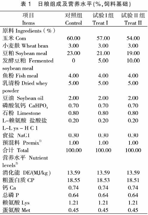 試驗(yàn)采用單因子設(shè)計(jì),選取120頭(29±2)日齡、平均體重為(7.98±0.05)kg的杜長(zhǎng)大三元雜交斷奶仔豬,按體重、性別和胎次基本一致原則分為3個(gè)處理組,每組4個(gè)重復(fù),每個(gè)重復(fù)10頭豬(公、母各半),每個(gè)重復(fù)為1欄。對(duì)照組添加60mg/kg的金霉素,試驗(yàn)I組添加30mg/kg的金霉素+5%的發(fā)酵飼料,試驗(yàn)II組添加10%的發(fā)酵飼料。預(yù)試期3天,試驗(yàn)期28天63組試驗(yàn)仔豬日糧組成和營(yíng)養(yǎng)水平均基本相同,參照《豬飼養(yǎng)標(biāo)準(zhǔn)》(NY/T65-2004)設(shè)計(jì)基礎(chǔ)飼糧(表1)。