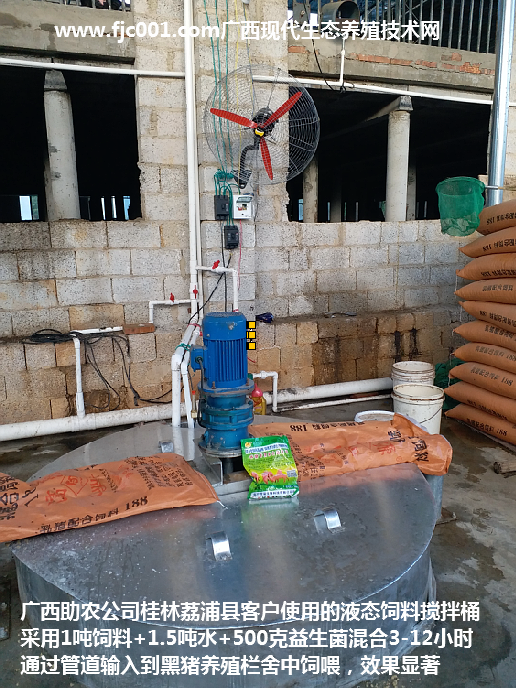 下圖是廣西助農(nóng)公司在桂林市荔浦縣客戶的現(xiàn)場圖,這個客戶全部使用短時間發(fā)酵全價飼料+養(yǎng)豬專用復合益生菌+水飼養(yǎng)黑豬。