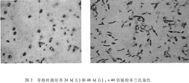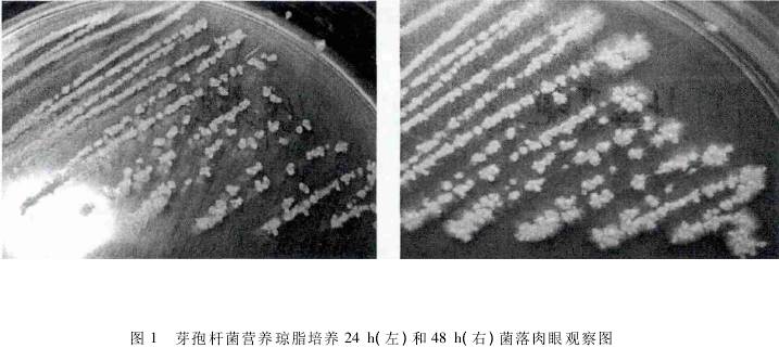 在營養(yǎng)瓊脂平板上,菌落粗糙半透明,灰白色或乳白色( 如圖1) ,再通過革蘭氏染色鏡觀察芽孢桿狀呈革蘭陽性,菌端呈鈍圓或平 。每個細胞只有一個芽孢,單個或鏈狀排列,無莢膜以周鞭毛運動,芽孢囊不明顯膨大( 如圖2) 。