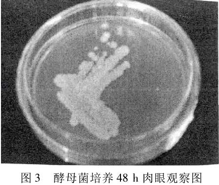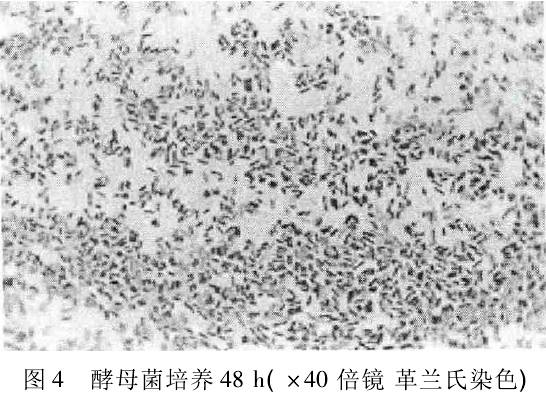 培養(yǎng)基菌落大而且厚,呈乳白色、土黃色,圓形,表面光滑濕潤,黏稠且扁平,邊緣整齊( 如圖 3) 。革蘭氏染色鏡檢觀察細胞呈圓形 。培養(yǎng)過程中呈多樣性,增殖方式為芽殖,且為一端芽殖,細胞核清晰,細胞間無雜質碎片( 如圖 4) 。