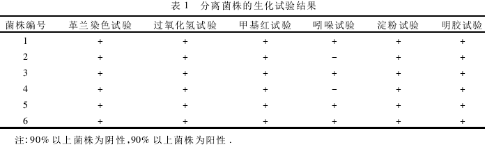 本試驗對土壤中分離得到的6株芽孢桿菌進行屬的鑒定,結果見表1。由表 1 可以看出,革蘭氏染色試驗和甲基紅試驗、過氧化氫試驗、吲哚試驗、淀粉試驗和明膠試驗均為陽性。根據形態(tài)特征和常規(guī)的生化鑒定結果將分離出的6株菌株確定為芽孢桿菌 。