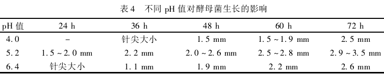 從表 4 可以看出,p H 值為 4. 0 時酵母菌在 24 h 內基本沒有生長 。從培養(yǎng) 3 d 的生長總體結果看,p H 值為 5. 2 時比 p H 值為 4. 0 和 6. 4 時的各階段菌株的生長情況更好些 。