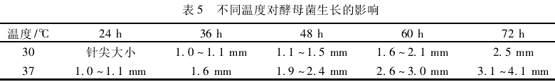 從表 5 可以統(tǒng)計出,相同時間內 37 ℃條件下酵母菌的生長速度比 30 ℃時生長速度快。