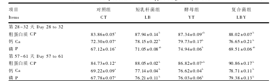 由表4可以看出,第1階段結(jié)束時(shí),與對(duì)照組相比,短乳桿菌組和復(fù)合菌組的粗蛋白質(zhì)、鈣表觀消化率顯著提高(P<0.05),酵母組的鈣、磷表觀消化率顯著升高(P<0.05)。第2階段結(jié)束時(shí),與對(duì)照組相比,短乳桿菌組和復(fù)合菌組的粗蛋白質(zhì)、鈣、磷表觀消化率顯著提高(P<0.05),酵母組的鈣、磷表觀消化率顯著提高(P<0.05} o