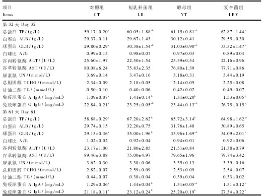 由表5可以看出,第1階段結(jié)束時(shí),與對(duì)照組相比,各益生菌組的血清IgA含量顯著提高(P<0.05);復(fù)合菌組的血清TP, GLB , IgG含量顯著升高(P<0.05)。第2階段結(jié)束時(shí),各益生菌組的血清Ig G含量顯著提高(P<0.05);短乳桿菌組的血清TP,GLB,IgA含量顯著提高(P<0.05);酵母組的血清TP含量顯著提高(P<0.05);復(fù)合菌組的血清GLB,IgA含量顯著提高(P<0.05}。