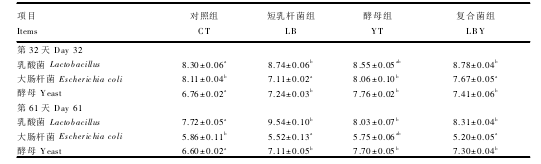分別于試驗(yàn)的第3261天,每個(gè)重復(fù)隨機(jī)選擇2頭豬采集新鮮糞樣,用于測(cè)定糞中乳酸菌和大腸桿菌的數(shù)量,菌群數(shù)量以每克糞便中所含細(xì)菌群落總數(shù)的對(duì)數(shù)[[1g (CFU/g)」表示。乳酸菌、大腸桿菌和酵母分別采用改良M RS培養(yǎng)基、伊紅