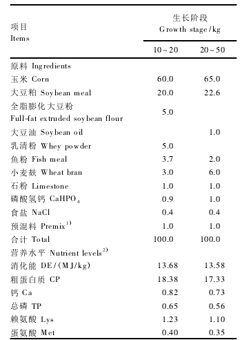 試驗(yàn)用基礎(chǔ)飼糧為參照NRC (1998)配制的粉狀飼料,分為10 } 20 kg20 } 50 kg 2個(gè)生長(zhǎng)階段配制,其組成及營(yíng)養(yǎng)水平見(jiàn)表1。試驗(yàn)豬舍為半敞開(kāi)式建筑模式,水泥地面圈養(yǎng),自由采食和飲水。按豬場(chǎng)常規(guī)程序進(jìn)行免疫、驅(qū)蟲(chóng)、消毒和管理等。