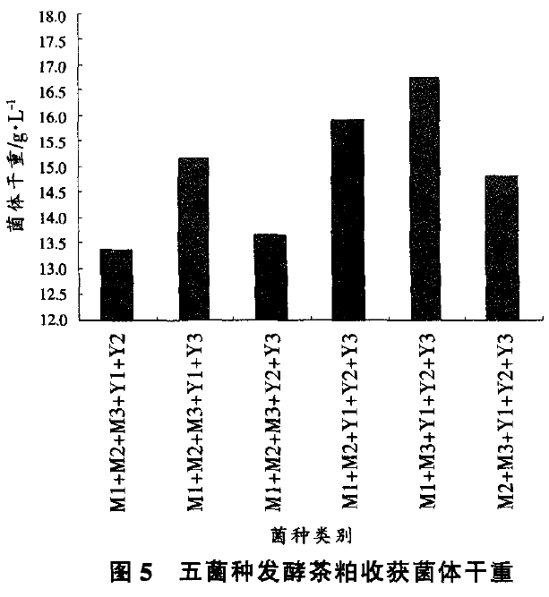 用250mL三角瓶裝茶粕固體發(fā)酵培養(yǎng)基15g,加水20mL,滅菌后接種五菌種的菌懸液(總接種量為15%,5種菌種的接種比為1:1:1:1:1),在室溫下培養(yǎng)4d。發(fā)酵結(jié)束后以收集到的菌體干重作為測(cè)試指標(biāo),試驗(yàn)結(jié)果見(jiàn)圖5??梢钥闯?,采用五菌種發(fā)酵茶粕培養(yǎng)基,發(fā)酵后收集到的菌體干重要比四菌種發(fā)酵低,這說(shuō)明多菌種發(fā)酵時(shí),并非菌種越多越好。因?yàn)榫N數(shù)增多.會(huì)消弱各菌種的優(yōu)勢(shì),且容易感染雜菌,使培養(yǎng)的目的菌種不能較好地生長(zhǎng)繁殖,故導(dǎo)致菌體干重減少。