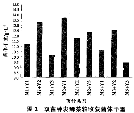 用250mL三角瓶裝茶粕固體發(fā)酵培養(yǎng)基15g,加水20mL,滅菌后接種雙菌種的菌懸液(總接種量為15%,2種菌種的接種比為1:1),在室溫下培養(yǎng)4d。發(fā)酵結(jié)束后以收集到的菌體干重作為測(cè)試指標(biāo),試驗(yàn)結(jié)果見(jiàn)圖2??梢钥闯?,采用雙菌種發(fā)酵茶粕培養(yǎng)基,發(fā)酵后收集到的菌體干重在9.43~13.74g/L之間,大于單菌種發(fā)酵獲得的菌體干重四,這是因?yàn)槊咕徒湍妇g存在一種協(xié)同作用,霉菌能分泌淀粉酶、纖維素酶及蛋白酶等酶類,降解淀粉、粗纖維及粗蛋白等物質(zhì),生成可被酵母菌直接利用的葡萄糖、氨基酸等小分子物質(zhì),酵母菌則在這些小分子營(yíng)養(yǎng)物質(zhì)的作用下不斷生長(zhǎng)繁殖,使發(fā)酵后茶粕含有較多的菌體細(xì)胞。