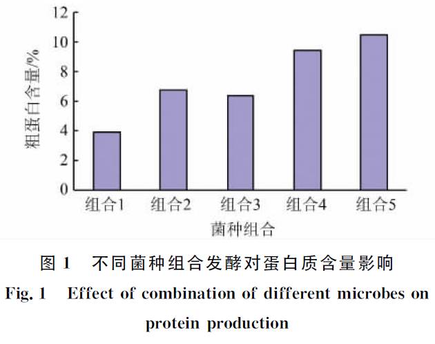 將各發(fā)酵菌種的種子液按表1中的組合方式及順序 (組合1為對(duì)照組, 不添加任何菌種) 接入經(jīng)纖維素酶水解后的固體培養(yǎng)基中, 各接種量均為5%, 30℃靜置發(fā)酵24h。定時(shí)攪拌以保持發(fā)酵物料各部位均勻, 防止結(jié)塊。結(jié)束后烘干, 測(cè)定粗蛋白含量。