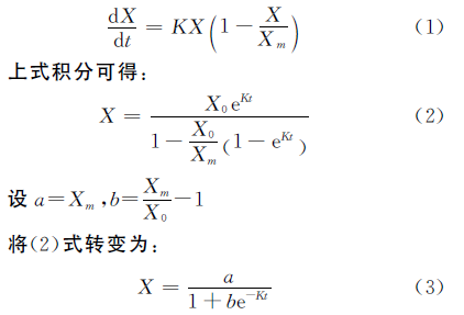 動(dòng)力學(xué)方程對(duì)于了解發(fā)酵機(jī)理、掌握整個(gè)發(fā)酵過(guò)程中混合菌群生長(zhǎng)的動(dòng)態(tài)變化、優(yōu)化發(fā)酵工藝具有重要的指導(dǎo)意義。設(shè)X、X0、Xm、K分別為粗蛋白含量的增加量 (%) 、初始增量 (%) 、最大增加量 (%) 和比生長(zhǎng)速率常數(shù) (h) , 則: