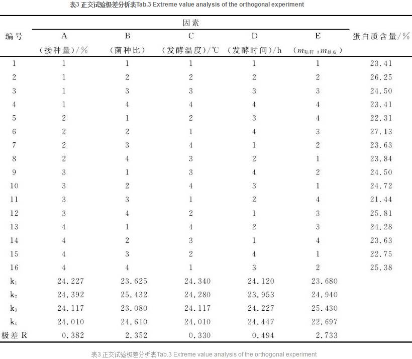 通過(guò)直觀分析法, 從表3的極差分析可知, 在所選的因素水平范圍內(nèi), 秸稈與麩皮的比例對(duì)發(fā)酵體系影響較大, 各因素影響的主次順序?yàn)?E>B>D>A>C, 并確定了最佳條件組合為A2B2C1D4E3, 即接種量為10%, 接種比例為1∶2∶1, 發(fā)酵溫度為28℃, 發(fā)酵時(shí)間48h, 秸稈與麩皮配比為4∶1。通過(guò)發(fā)酵, 物料中粗蛋白含量由起始時(shí)的5.47%提高到27.13%。