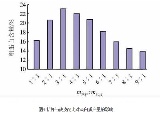 本著以粗代精、以廢代好、降低成本的原則, 對(duì)發(fā)酵培養(yǎng)基進(jìn)行優(yōu)化。麩皮含有豐富的蛋白質(zhì)、碳水化合物、維生素及微量元素, 可為微生物發(fā)酵提供天然的有機(jī)碳源、氮源和營(yíng)養(yǎng)因子。實(shí)驗(yàn)考察了發(fā)酵培養(yǎng)基中秸稈與麩皮的不同配比對(duì)生物合成蛋白質(zhì)的影響。由圖4可知, 秸稈與麩皮的最適配比為3∶1, 粗蛋白產(chǎn)量為23.19%。
