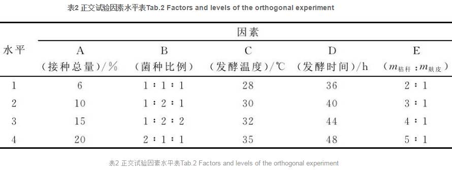 正交實(shí)驗(yàn)表明, 影響發(fā)酵主要因素的主次順序?yàn)?秸稈與麩皮配比>接種比例>發(fā)酵時(shí)間>接種量>發(fā)酵溫度;發(fā)酵的最適條件為:總接種量為10%, 米曲霉、產(chǎn)朊假絲酵母、枯草芽孢桿菌的接種比例為1∶2∶1, 發(fā)酵溫度為28℃, 發(fā)酵時(shí)間48h。發(fā)酵產(chǎn)物中粗蛋白含量達(dá)到27.13%。