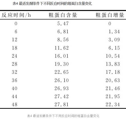 動(dòng)力學(xué)分析有助于了解整個(gè)發(fā)酵過(guò)程中混合菌群生長(zhǎng)的內(nèi)部變化規(guī)律, 可作為控制發(fā)酵生產(chǎn)周期的重要依據(jù)。本研究表明, 發(fā)酵的穩(wěn)定期在26~35h之間。因此, 將最適發(fā)酵周期由48h優(yōu)化為35h, 發(fā)酵產(chǎn)物的粗蛋白含量為25%左右。