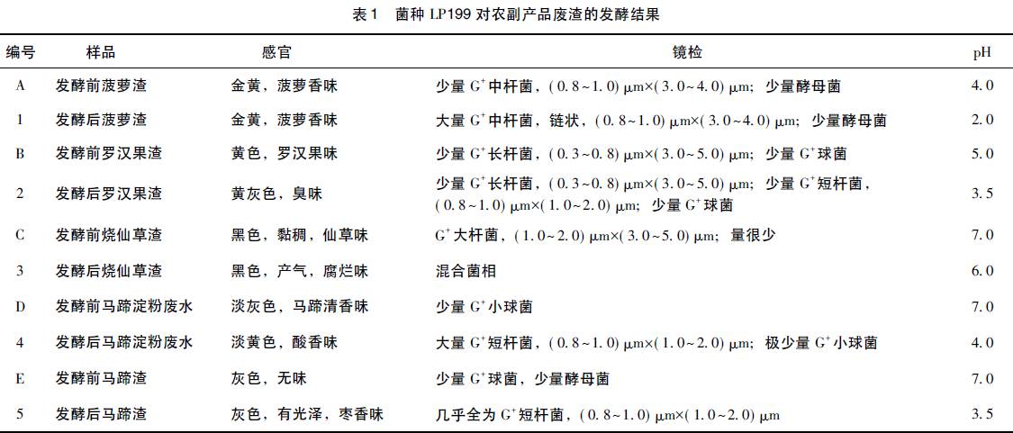 利用植物乳桿菌LP199 對菠蘿渣、羅漢果渣、燒仙草渣、馬蹄淀粉廢水及馬蹄渣等進行發(fā)酵試驗,結果見表1。