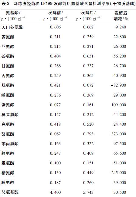 馬蹄渣經菌種LP199 發(fā)酵后,其氨基酸含量由4.400 g /100 g 增加至5.743 g /100 g,總量增加30. 50%。氨基酸中,只有胱氨酸減少,其余全部增加,增加超過50%的有谷氨酸、酪氨酸、蛋氨酸、苯丙氨酸、賴氨酸、組氨酸和精氨酸,其中后5 種氨基酸為畜禽必需氨基酸。氨基酸含量的變化反映出菌種LP199 復雜的生理代謝作用,因為氨基酸本身就是乳酸菌的良好底物,所以發(fā)酵后氨基酸含量的增加可能來源于菌體的增加,表明菌種LP199 是一種優(yōu)良的單細胞蛋白。