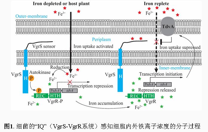 中科院微生物所錢韋研究組致力于研究植物病原細(xì)菌的信號感知機(jī)制。最近他們發(fā)現(xiàn),在十字花科蔬菜黑腐病的病原-野油菜黃單胞菌中,一個稱為VgrS-VgrR的分子系統(tǒng)承擔(dān)著探測細(xì)胞內(nèi)、外鐵離子濃度的核心功能。VgrS-VgrR屬于細(xì)菌的雙組分信號轉(zhuǎn)導(dǎo)系統(tǒng),此類系統(tǒng)在細(xì)菌中扮演著類似人類“智商(IQ)”的生物學(xué)功能,能夠感知外界環(huán)境刺激并控制細(xì)胞產(chǎn)生適應(yīng)反應(yīng)。其中,VgrS是一個位于細(xì)菌細(xì)胞膜上,發(fā)揮外界信號探測功能的受體組氨酸激酶。當(dāng)細(xì)菌生存于鐵離子匱乏的環(huán)境中時,會激活VgrS的激酶活性,并將細(xì)胞內(nèi)的VgrR蛋白磷酸化。被磷酸化后的VgrR蛋白能夠控制數(shù)十個轉(zhuǎn)運(yùn)鐵元素相關(guān)基因的表達(dá),從寄主體中“爭搶”寶貴的鐵資源。有趣的是,在這個過程里,VgrR必須嚴(yán)格抑制一個細(xì)菌外膜通道蛋白(TdvA)的表達(dá),否則這個“任性”的自身通道蛋白會嚴(yán)重干擾細(xì)菌對鐵的吸收過程,關(guān)閉其表達(dá)才能使細(xì)菌正常感染植物。