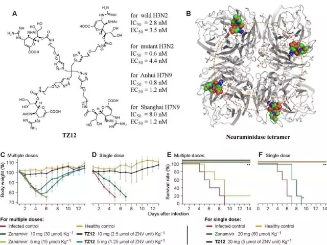 近日,中國科學(xué)院微生物研究所高福研究組和李學(xué)兵課題組于Journal of Medicinal Chemistry(IF:5.589 )報道了一種新型具有高效抗流感活性的化合物TZ12。他們在仔細(xì)分析神經(jīng)氨酸酶(NA)與扎那米韋的復(fù)合物晶體結(jié)構(gòu)后,采用計算機(jī)輔助藥物開發(fā)技術(shù)設(shè)計并合成了一系列的四價扎那米韋分子。其中化合物TZ12在隨后的蛋白、細(xì)胞、小鼠水平的生物活性評價實(shí)驗(yàn)中表現(xiàn)出了對不同亞型的流感病毒株(包括耐藥流感病毒株)表現(xiàn)出了較已有抗流感藥物扎那米韋(zanamivir)更加優(yōu)秀的抑制活性,有進(jìn)一步進(jìn)行臨床前開發(fā)的潛力。另外,對感染了流感病毒的小鼠滴鼻給藥一次TZ12就可以保護(hù)所有小鼠。另外,綜合X晶體衍射實(shí)驗(yàn)、表面離子共振(SPR)實(shí)驗(yàn)、超速離心分析實(shí)驗(yàn)(AUC)和透射電鏡實(shí)驗(yàn)(TEM)的研究結(jié)果表明TZ12的四個扎那米韋藥效團(tuán)可以同時進(jìn)入到NA四聚體上的四個活性位點(diǎn)中,從而與NA四聚體形成熱力學(xué)更加穩(wěn)定的1:1復(fù)合物,從作用機(jī)制上解釋了TZ12具有高效抗流感病毒活性的原因。