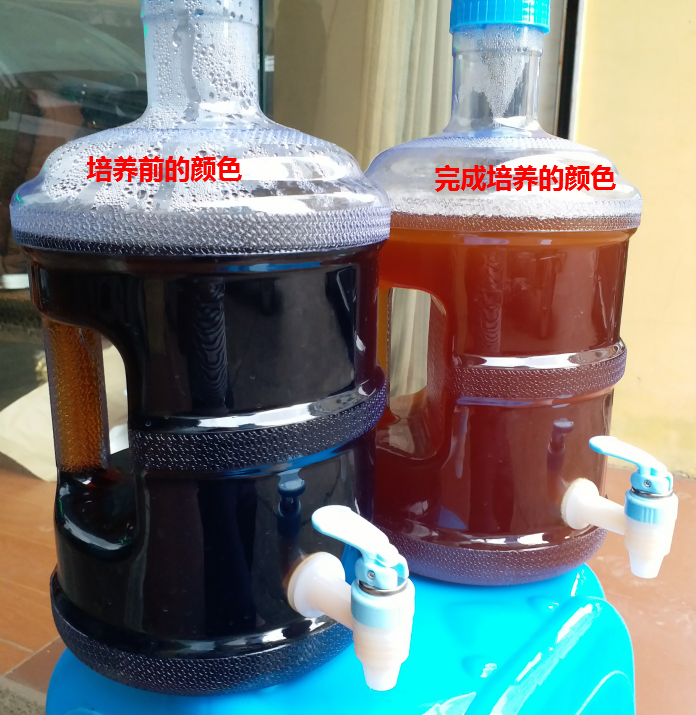 4.操作方法:將上述原料全部倒入塑料桶混合,擰緊桶蓋,最佳培養(yǎng)環(huán)境溫度為25℃-35℃,低溫季節(jié)建議放在溫度30℃以上的環(huán)境中,不要讓太陽直照,每天搖動(dòng)培養(yǎng)塑料桶一次和放氣數(shù)次(沒有時(shí)間在家可以將瓶蓋蓋得微微緊,氣體一大就會(huì)自動(dòng)放氣,這個(gè)需要經(jīng)驗(yàn)總結(jié)),會(huì)看到桶內(nèi)產(chǎn)生大量的小氣泡,PH值逐漸變小,3-7天(初次培養(yǎng)溫度過低可能需要更長時(shí)間)PH值在5以下時(shí)就可以使用(明顯酸味,此時(shí)有效活菌數(shù)≥100億cfu/ml)。