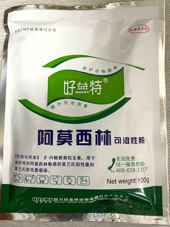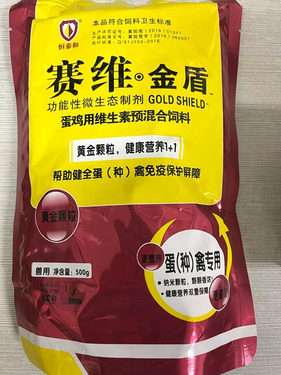 在飼料中添加阿莫西林每包拌料200斤, 水溶性肝油粉每包拌料200斤, 賽維金盾蛋雞用維生素預混合飼料每包拌800斤。