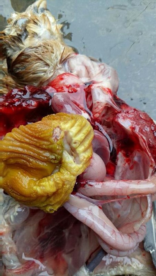2.肌胃病變:雞內(nèi)金有數(shù)個(gè)不規(guī)則潰瘍?cè)?,肌胃壁增厚、水腫,嚴(yán)重的整個(gè)雞內(nèi)金潰爛、自動(dòng)脫落。