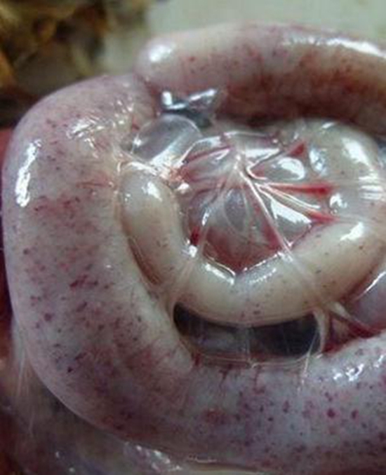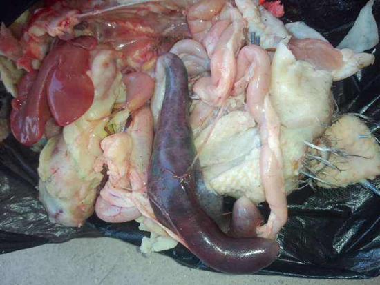 病死雞解剖可見(jiàn)病雞的腸壁增厚,腸道鼓起,腸壁有出血點(diǎn)、黏膜有出血小點(diǎn)、腸內(nèi)容物樣發(fā)黑等癥狀,盲腸球蟲(chóng)主要造成盲腸腫大,可為正常的3-5倍,其內(nèi)充滿血液、血凝塊、黏膜脫落物,有的盲腸內(nèi)形成由血液、凝塊、上皮、糞便等混合而成的硬固干酪物,俗稱“腸栓”。