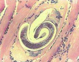 形成包囊的蟲體,其包囊與周圍肌纖維間有明顯界限,包囊內(nèi)通常含有1個清晰盤卷的蟲體,嚴重感染者,亦有包囊含2條至數(shù)條蟲體的。鈣化的蟲體鏡檢可見輪廓模糊的蟲體及包囊,連同包囊都鈣化后,在鏡下為一黑色團塊。
