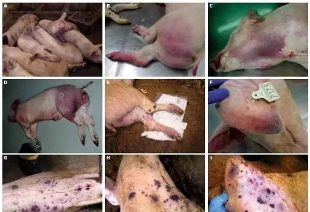 非瘟臨床癥狀:高熱(積留熱),嘔吐(后期吐血),腹瀉或便秘,有的便血、虛弱、難以站立,體表不同部位(尤其是耳、鼻、腹部、臀部)皮膚呈紅色、紫色或藍色,有的咳嗽、呼吸困難。母豬流產(chǎn)、死胎或弱胎依臨床癥狀不同,可分為超急性型,急性型,亞急性型和慢性型。