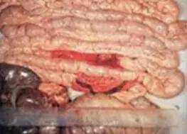 病變:回腸、結(jié)腸前端腸壁增厚,直徑增加,漿膜和腸系膜水腫,腸粘膜呈腦回狀(結(jié)締組織樣),粘膜肥厚、表面濕潤。